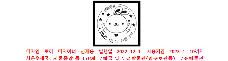 우표발행일 : 2022. 12. 1. 우표번호 : 3631 ~ 3632. 디자인 : 설경 속 토끼