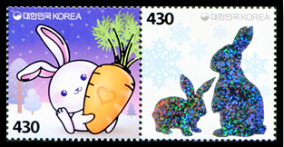 눈 내리는 겨울 배경의 이번 연하우표는 2종으로 구성되었습니다. 귀여운 자태로 당근을 들고 있는 토끼의 표정과 어미와 새끼를 연상케 하는 마주보고 있는 두 마리 토끼의 모습이 온화하고 다정해 보입니다. 토끼처럼 지혜롭고 현명하게 새해를 맞이하여 2023년 한 해 동안 다복하고 건강하게 지내시기를 바랍니다.