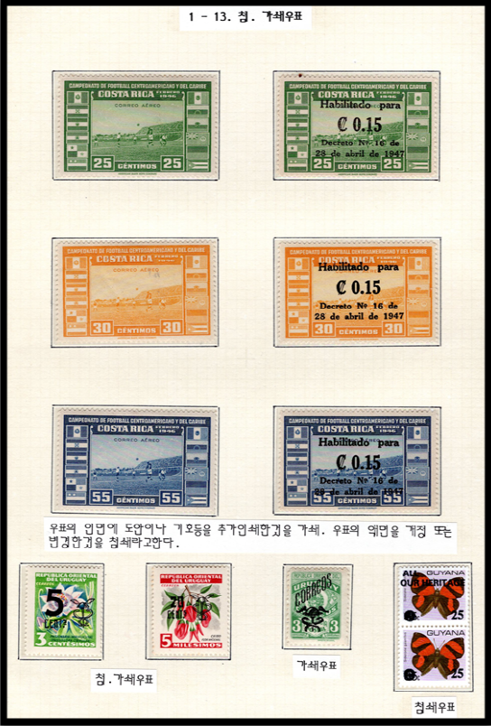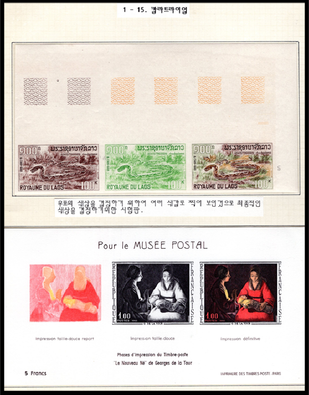 우표 발행시 우표의 색상을 결정 하기 위하여 여러 색갈로 인쇄. 최종적인 색상을 선택키 위한 우표.