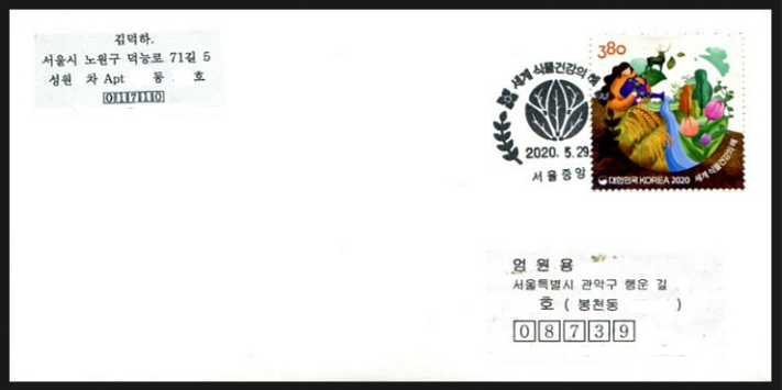 세계 식물 건강의 해, 초일커버(FDC) 우표발행일 : 2020. 5, 29 우표번호 : 3447 디자인 : 지구와 식물 디자이너 : 정은영 인쇄/색수 : 평판/4도 용지 : 평판원지 인쇄처 : 한국우편사업진흥원(Southem Colour Print) 건강한 식물의 중요성과 이를 지키기 위한 노력의 필요성을 알리고 글로벌 협력과 투자를 강화하고자 유엔(UN)은 2020년을 세계 식물건강의 해로 지정하였습니다. 우정사업본부는 이를 기념하여 세계 식물건강의 해 기념우표를 발행합니다. 식물은 우리가 숨 쉴 수 있는 공기의 원천이며, 우리가 먹는 대부분의 식량이기도 합니다. 유엔식량농업기구(FAO)의 집계에 따르면 매년 세계 식량작물의 최대 40%가 병해충으로 인해 손실 되고 있는데, 이를 비용으로 환산하면 식..