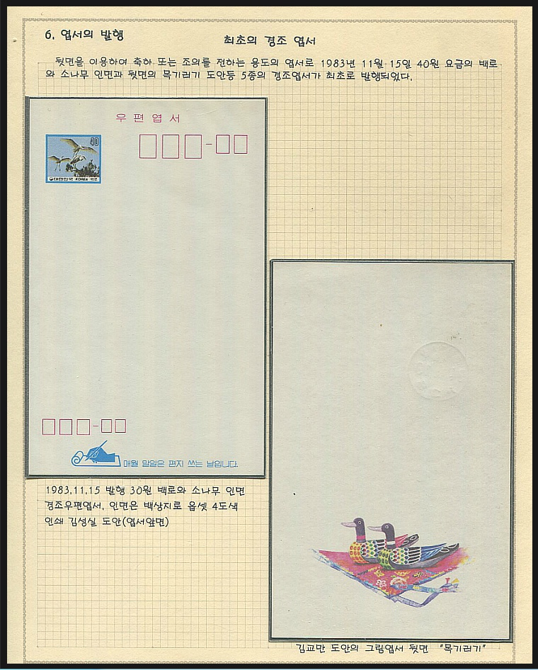 한국 최초 79. 최초의 경조 엽서 한국 최초 79. 최초의 경조 엽서 우편 엽서류는 우표이외에 우체국에서 판매되는 일체의 우편물을 일컽는데, 일반적으로 사용하는 통상엽서 이외에 목적별로 여러 종류의 엽서류가 있습니다.이중 경조엽서는 각종 기념행사(결혼, 회갑, 입학, 조의 등)를 기념, 축하를 위해 발행된 엽서가 있으며, 우리나라에서는 1983년 11월 15일 5가지의 경조엽서를 처음 발행 하였다. 공감 ♡ 눌러주세요 선박의 역사 . 한국 최초. 2020.06.08