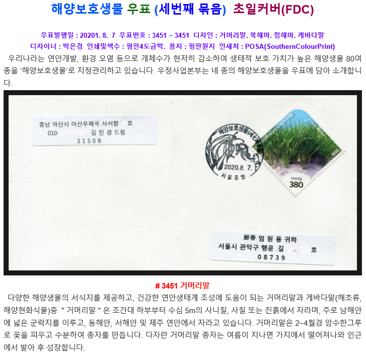 해양보호생물 우표 (세번째 묶음) 초일커버(FDC)