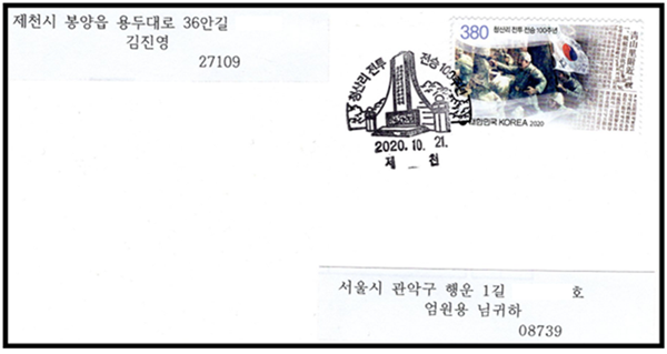 청산리 전투 전승 100주년. 기념우표 초일커버(FDC) 우표발행일 : 2020. 10. 21 우표번호 : 3464 디자인 : 청산리 전투 디자이너 : 신재용 인쇄 / 색수 : 평판 / 4도 용지 : 평판 원지 인쇄처 : 한국우편사업진흥원(Royal Joh Xnschede) 35년의 일제 치하에서 우리 민족에게 큰 승리를 안겨준 청산리 전투가 올해로 100주년을 맞았습니다. 우정사업본부는 독립군이 일본군을 상대로 벌인 역사상 최대 규모의 전투였던 청산리 전투의 전승 100주년을 기리고자 기념우표를 발행합니다. 1919년 3·1운동을 기점으로 독립군은 두만강과 압록강 접경지에서 더욱 활발한 활동을 전개하였습니다. 특히 독립군은 1919년 하반기부터 국내진입작전을 펼쳤고, 1920년 들어서는 임시정부를 지지..