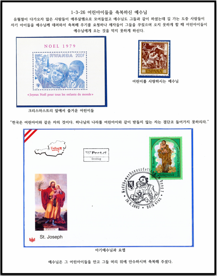 우표로 엮는 성경(신약) 이야기.... 13. 1. 복음서 1 - 3 예수님의 교훈과 병소침사역 - 10. 어린아이들을 축복하신 여수님. 당시 사람들은 어린아이들을 랍비나 장로들에게 데려와 안수를 통하여 축복받게 하였습니다. 이러한 관례에 따라 사람들이 예수님의 축복하심을 바라고 어린아이들을 주께 데려왔는데 제자들이 제지하였습니다. 제자들이 왜 이들을 제지하였을까? 정확히는 알 수 없지만 예수님의 사역에 방해가 된다고 판단했기 때문일 것입니다. 어찌되었던 제자들은 어린아이들을 우선순위로 두지 않았습니다. 그렇지만 예수님은 제자들과 생각이 다르셨습니다. 어린아이들을 영접하시고 천국이 이런 자의 것이라고 하셨습니다. 예수님은 어린아이들을 사랑하셨습니다. 어린아이들이 천국의 주인 된 자들이라 인정해주셨습니다...