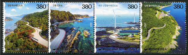 해안 경관도로(Coastal Roads) 기념우표 발행 발행일 : 2021. 7. 15. 우표번호 : 3524 ~ 3527 디자이너 : 정은영 인새 색수 특수처리 : 평판. 4도. 은박. 디자인 : 영광 백수해안도로. 강릉 헌화로. 제주 신창풍차해안도로. 남해 물미해안도로. 사진 : 김창환( 백수해안도로. 강릉 헌화로. 남해 물미해안도로) 인쇄처 : 한국우편사업진흥원(Cartor) 삼면이 바다인 우리나라는 동해, 서해, 남해 어디를 가도 아름다운 해안의 풍광을 감상할 수 있습니다. 특히 해안을 따라 만들어진 해안도로는 자동차를 타고 편하게 즐길 수 있는 드라이브 코스로 제격입니다. 우정사업본부는 대한민국의 아름다운 해안도로 4곳을 선정하여 ‘해안 경관도로’ 기념우표를 발행합니다. 영광 백수해안도로 유독 ..