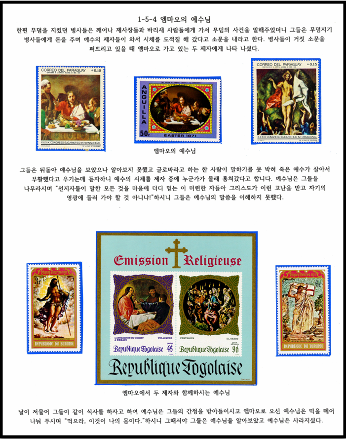 우표로 엮는 성경(신약) 이야기.... 21. 1. 복음서 1 - 5 부활의 예수님 - 2. 부활하신 주님을 가장 먼저 경배한 이들은 여인들이었다. 여인들은 향료를 준비하여 무덤에 간다. 여인들은 매우 이른 아침, 해가 떠오를 무렵이었다. “매우 이른 아침” 은 죽음을 이기신 주님의 영광으로 말미암아 고귀한 품위를 얻게 되었다. 예수님께서는 부활하심으로써 이른 아침을 경사롭게 만드시고, 당신 부활의 빛으로 빛나게 하셨다. 엠마오의 예수님. 엠마오 이야기는 클레오파스와 다른 제자가 예루살렘에서 엠마오라는 마을로 가던 길에 부활하신 예수님을 만난 감동적인 체험을 전한다. 이 두 사람이 예루살렘에서 엠마오라는 마을로 가고 있었다. 두 제자가 가던 길에 예수님이 다가 오셨다. 그러나 그들은 그분을 알아보지 못하..