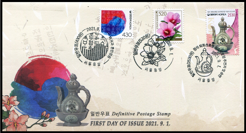 일반우표 3종 (430원. 520원. 2530원.) 발행 발행일 : 2021. 9. 1. 용지 : 평판 원지. 디자이너 : 430원 유지형. 520원 박은경 2530원 신재용 디자인 : 430원 태극과 훈민정음. 520원 무궁화. 2530원 청자퇴화초화문 표주박 모양 주전자 및 승반. 인쇄 및 색수 : 430원 - 평판 4도. 520원 - 평판 4도 금분 2530원 - 평판 4도 시변각 은박 미세문자 특수천공 우표번호 : 3532 ~ 3534. 인쇄처 : 430원 520원 - 한국조폐공사. 2530원 - 한국우편사업진흥원 / Cartor 2021년 9월 1일부터 우편요금이 조정되면서 통상우편 기본요금은 430원, 통상우편 규격 외 요금은 520원, 등기우편 기본요금은 2,530원으로 각각 50원씩 인상됩..