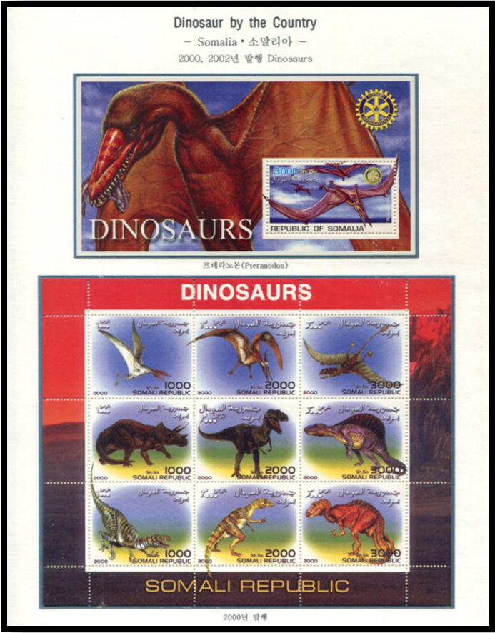 공룡우표 발행국 소개..... 215. 소말리아 공화국(Somali Democratic Republic) 소말리아(Somalia) 정식 명칭은 소말리아 공화국(Somali Democratic Republic)이다. 북쪽은 아덴만, 동쪽과 남쪽은 인도양으로 둘러싸여 있어 해안선 길이가 3025㎞에 달한다. 면적은 63만 7657㎢, 인구는 1061만 6380명(2015년 현재)이며, 수도는 모가디슈(Mogadishu)이다. 국민의 약 85%가 소말리아인이며, 종교는 99%가 이슬람교 수니파로, 이는 사실상 국교나 다름없다. 공용어는 소말리아어이나 아랍어도 역시 공용어로 사용되고, 이밖에 이탈리아어와 영어도 광범위하게 사용되고 있다. 국토의 대부분이 건조하고 북쪽 해안지방은 고온이며 남쪽으로 갈수록 강우량이..
