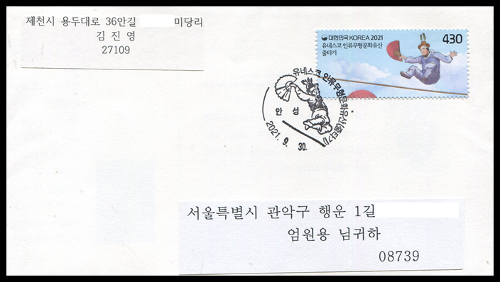 유네스코 인류무형문화유산 줄타기 기념우표 초일커버(FDC) 발행일 : 2021. 9. 30. 우표번호 : 3539 ~ 3540. 디자인 : 허공뛰기. 외무름훑기 디자이너 : 정은영 인쇄 / 색수 / 특수처리 : 평판 / 4도 / 적박. UV 코팅. 용지 : 평판원지 인쇄처 : 한국우편사업진흥원 / Royal Joh. Enschede / POSA(조엔쉐터社) 줄타기는 높이 3m, 길이 12m 간격으로 세운 작수목에 지름 3cm짜리 줄을 설치하고, 줄 위를 걸으며 노래·춤·기예를 하며 재담을 늘어놓는 우리나라 전통 공연예술입니다. 곡예 기술에 중점을 두는 세계 여러 나라의 줄타기와 다르게 우리나라의 줄타기는 음악 연주를 배경으로, 줄을 타는 줄광대와 땅에 있는 어릿광대가 대화를 주고받는다는 특징이 있습니다...