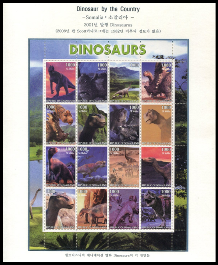 공룡우표 발행국 소개..... 216. 소말리아 공화국(Somali Democratic Republic)...... 2. 소말리아(Somalia) '아프리카의 뿔'에 해당하는 대륙 최동단의 돌출부에 있으며, 적도에서 홍해까지 뻗어 북쪽은 아덴 만, 동쪽은 인도양, 서쪽은 케냐와 에티오피아, 북서쪽은 지부티와 각각 접하고 있다. 국민의 약 4/5가 소말리아인이며, 기타 반투족과 아랍족이 있다. 소말리아 인구의 2/3 이상이 유목민이거나 반유목민이고, 공식어는 소말리어와 영어이며, 전국적으로 통용되는 소말리어는 소말리아를 하나로 묶어주는 가장 강력한 요인 중의 하나이다. 이슬람교가 사실상 공식 종교이며, 소말리아의 경제는 주로 축산과 농업에 기반을 두고있다. 소말리아에는 철도가 없으며, 철도를 대신해 트럭과..