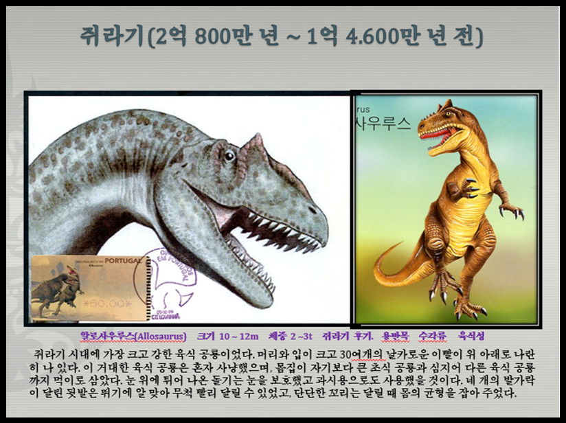 기(紀) 별 대표적인 공룡들 ....... 7. 쥐라기(Jurassic Period) 3. 쥐라기는 지질연대상 트라이아스기의 다음에 해당된다. 비록 트라이아스기에 공룡이 생겨나 2500만 년에 걸쳐 진화하기는 했지만 실제로 번성했던 것은 쥐라기에 들어서이다. 아파토사우루스 같은 거대한 용각아목 초식공룡이 육지를 배회하고 스테고사우루스처럼 골판 달린 공룡이 처음 나타났으며 알로사우루스 같은 거대한 육식공룡이 다른 공룡을 잡아먹었던 것도 이때였다. 또한 쥐라기에는 새의 조상이라고 여기는 시조새, 즉 아르카에옵테릭스(Archaeopteryx)가 날아다니기도 했다. (한권으로 끝내는 공룡) 알로사우루스(Allosaurus 異特龍 ) 후기 쥐라기(1억 5600만 년 전 ~ 1억 4500만 년 전)를 대표하는 큰 ..