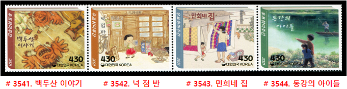 우표취미주간 기념우표 초일커버(FDC) 우표 발행일 : 2021. 10. 25. 우표번호 : 3541 ~ 3544(4종) 인쇄/ 색수/특수처리 : 평판/4도/UV코팅 액면가격 : 430원. 용지 : 평판 원지 디자인 : 백두산 이야기. 넉 점 반. 만희네 집. 동강의 아이들. 디자이너 : 정은영 원화 : 류재수. 이원경. 권윤덕. 감재홍. 우표크기 : 42.8 X 35 전지 구성 : 4 X 4 인쇄처 : 한국우편사업진흥원 / SouthermColour Print 우정사업본부는 우표를 모으고 우정 문화에 관심이 깊은 분들을 위해 1973년부터 우표취미주간을 선정하여 이 기간에 ‘대한민국 우표전시회’를 개최하고 기념우표를 발행합니다. 올해는 10월 25일부터 11월 7일까지를 우표취미주간으로 정하고, 그림책..
