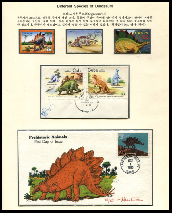 우표로 보는 공룡의 종류.................177. 스테고사우루스(Stegosaurus) 스테고사우루스(Stegosaurus) .......... 2. 검룡류에 속하는 공룡의 한 속. 몸길이는 약 6.5m에 가까웠으나 두개골과 뇌는 큰 몸집에 비해서 매우 작았다. 뒷다리보다 앞다리가 아주 짧아서 등이 독특한 활 모양을 하고 있었다. 두드러진 특징은 골침이라 불리는 꼬리가시와 등에 있는 3각형 모양의 골판이다. 골침은 주로 다른 생물들의 공격에 대응하는 무기로, 골판은 체온조절 용도로 사용했을 것으로 추정된다. 입은 딱딱하고 이빨은 아주 작고 약했으며, 부드러운 식물을 먹는 순한 초식동물이었다. 가실 때 아래 ♡ 공감 꾹 눌러주세요~~ 감사합니다.