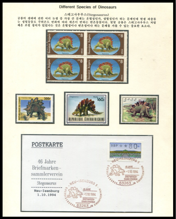 우표로 보는 공룡의 종류.................178. 스테고사우루스(Stegosaurus) - 2. 스테고사우루스(Stegosaurus) 스테고사우루스는 장순아목 검룡류 공룡의 한 속이다. 어원은 고대 그리스어로, "지붕 도마뱀" 또는 "덮인 도마뱀"이라는 뜻이다. 스테고사우루스는 1억 5천 만년 전 쥐라기 후기 오늘날의 북아메리카 서부에서 서식했다. 2006년 포르투갈에서 표본이 발견되면서 유럽에서도 서식했다는 것이 밝혀졌다. 특유의 꼬리 가시와 골판으로 스테고사우루스는 가장 잘 알려진 공룡 중 하나이다. 모리슨층 상부에서 최소한 세 개의 종과 약 80 개체의 화석이 발견되었다. 스테고사우루스는 크고 육중한 체격, 네 개의 짧은 다리를 가진 초식공룡이다. 뒷다리에 비해 짧은 앞다리를 가져 등이..