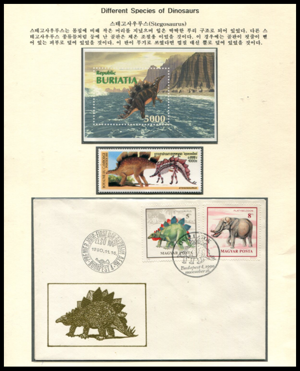 우표로 보는 공룡의 종류..............179. 스테고사우루스(Stegosaurus) - 3. 스테고사우루스(Stegosaurus) 후기 쥐라기에 살았던 검룡류인 스테고사우루스는 목부터 꼬리까지 한 쌍으로 있는 골판 중에 골반위에 있는 골판이 가장 크고 골편의 크기는 각각 다르며, 꼬리에 위치하고 있는 골침은 하늘을 향하고 있다. 검룡류의 커다란 골반은 꼬리와 뒷다리의 큰 근육을 지탱하는 역할을 한다. 앞발보다 뒷발이 길고 튼튼하여 항상 머리를 지면 쪽으로 향해 있는 것이 특징이며, 작은 머리와 짧은 목을 가지고 있다. 육식 공룡의 공격은 무시무시한 꼬리 골침을 좌우로 휘둘러 육식 공룡의 연약한 배나 다리를 찔러 물리쳤을 것으로 짐작된다. (국립중앙과학관 공룡 과학관) 가실 때 아래 ♡ 공감 꾹..