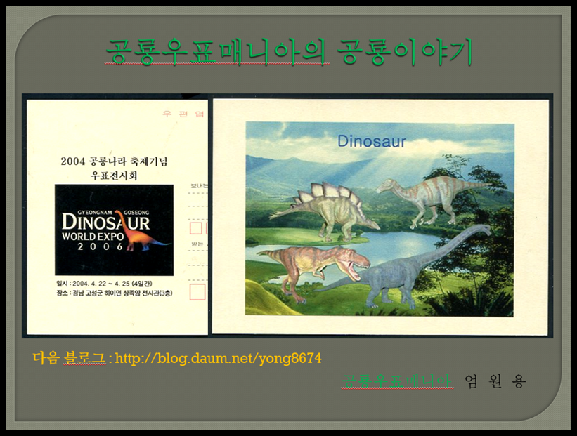 공룡우표매니아의 공룡이야기.............1. 1. 공룡 시대 2. 어류에서 양서류로.... 3. 기데온 먼텔 4. 리차드 오웬 공룡 시대(恐龍時代) 공룡은 중생대(약 2억 5천만 년 전에서 6천 5백만 년 전까지의 시대)에 크게 퍼져 살다가 지구 위에서 자취를 감춘 커다란 파충류의 한 무리이다. 몸 길이는 아주 작은 것부터 큰 것은 30m이상인 것도 있었다. 대부분 몸집에 비해 머리가 매우 작은 편이다. 특별한 종을 제외 하고, 공룡의 화석은 미국 · 영국 · 독일 · 중국 · 인도 · 오스트레일리아 · 아프리카 등지에서 발견된다. 우리나라에서도 중생대의 지층인 경상남도와 경상북도에서 발견된다. 공룡이 살았던 중생대는 지금으로부터 약 2억 5,000만 년 전에 시작되어 약 6,500만 년 전까지..