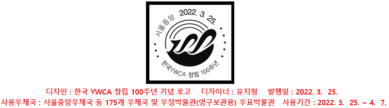 한국YWCA 창립 100주년 기념우표 초일커버(FDC) 우표번호 : 3570. 디자인 : 한국YWCA 창립 100주년 기념 로고. 발행일 : 2022. 3. 25. 디자이너 : 유지형. 인쇄 및 색수 : 평판/4도/투명필름 용지 : 평판 원지. 인쇄처 : 한국우편사업진흥원 / Carytor 기독교정신을 바탕으로 여성의 자립을 돕고 건강한 공동체를 확립하는 데 앞장서는 한국YWCA가 창립한 지 올해로 100년이 되었습니다. 한국YWCA는 일제강점기부터 오늘날에 이르기까지 여성 인권 운동을 비롯하여 평화통일, 탈핵·기후·생명 운동 등 다양한 시민운동을 펼쳐온 단체입니다. 한국YWCA는 전 세계 108여 개국 글로벌 네트워크를 보유하고 있는 세계YWCA의 정식 회원국입니다. ‘YWCA’라는 이름이 상징하듯 청..