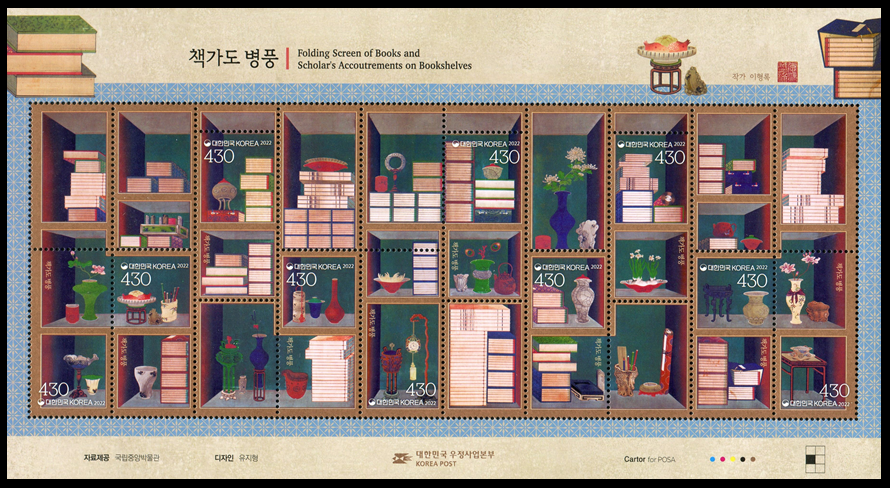책가도 병풍 기념우표 초일커버(FDC) 우표번호 : 3571 ~ 3580 (10종) 디자인 : 이형록의 책가도 병풍 디자이너 : 유지형 발행일 : 2022. 3. 30. 인쇄 / 색수 : 평판 / 4도. 금분 용지 : 평판 원지 인쇄처 : 한국우편사업진흥원 / Cartor 자료제공 및 내용 감수 : 국립중앙박물관. 문화포털. ‘책가도(冊架圖)’는 책장 선반에 책과 문방구, 도자기, 청동기, 꽃과 과일 등 다양한 물건이 놓인 모습을 그린 병풍으로, ‘책거리’라고도 불립니다. 조선 후기인 18세기에 귀한 책을 모으고 골동품을 감상하는 취미가 널리 퍼지면서 책가도가 유행하게 되었습니다. 특히 문치 정치를 표방했던 정조의 책가도 사랑은 유별났습니다. 정조는 창덕궁 어좌 뒤에 책가도 병풍을 펼쳐놓고 신하들에게 자..