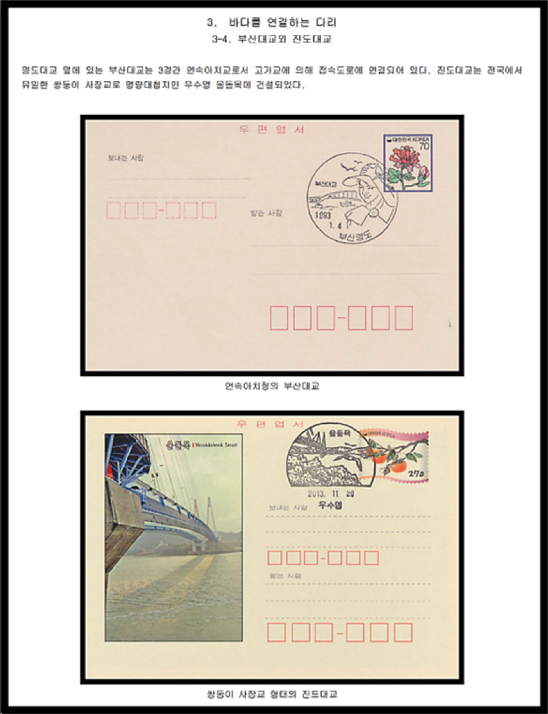 아름다운 다리를 찾아서.................... 3. 3. 바다를 연결하는 다리. 4. 계곡을 건너는 다리 부산대교와 진도대교(釜山大橋 珍島大橋) 영도대교가 영도(影島)와 시내를 연결하는 유일한 다리로서 영도지역의 교통량을 소화하는 데에 있어 한계점에 도달하게 된 상황에서, 부산대교의 건설은 항만물동량의 소통을 원활하게 하고 영도지구의 개발을 촉진시켜주는 효과를 주고 있다. 또한, 우리나라 기술진에 의해 설계· 시공이 완료되어 국내 기술의 발전 및 향상을 가져오는 계기도 되었다. 진도대교는 2등교로서 총중량이 32.4t 이상은 통과할 수 없었다. 그리하여 2001년 12월 착공 4년 만에 길이 484m, 너비 12m 의 2차로로 제2진도대교가 개통되어 국내 최초로 쌍둥이 사장교가 건설되었다. ..