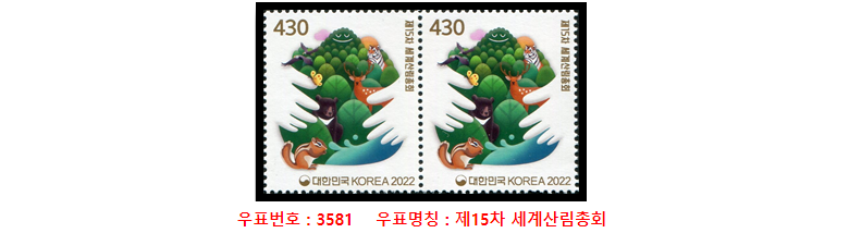 제 15 차 세계산림총회 기념우표 초일커버(FDC) 우표명칭 : 제15차 세계산림총회 디자인 : 자연을 포용하는 아름다운 우리 산림 디자이너 : 김미화 발행일 : 2022. 4. 5. 우표번호 : 3581 인쇄 / 색수 : 평판 / 4도 금분 용지 : 평판 원지 인쇄처 : 한국우편사업진흥원 / Southern Colour Print 자료제공 및 내용 감수 : 산림청 우리나라는 일제강점기와 6·25전쟁을 거치면서 전 국토가 심각하게 훼손되었습니다. 그러나 1970년대에 정부가 전 국민을 대상으로 하는 산림녹화 운동을 전개한 결과, 민둥산은 서서히 울창한 산림으로 변하게 되었습니다. 2020년 10월, 유엔식량농업기구(FAO) 산림위원회(COFO)의 발표에 따르면 최근 25년간(2015년 기준) 한국의 산림..