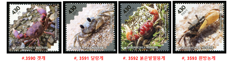 해양보호생물(다섯 번째 묶음) 우표발행. 우표명칭 : 햐양보호생물 (시리즈5,) 디자인 : 갯게. 달랑게. 붉은벌멍똥게. 흰발농게. 디자이너 : 박은경 발행일 : 2022. 3. 20. 우표번호 : 3590 ~ 35903. 인쇄 / 색수 / 특수처리 : 평판 / 4도 / 금박 용지 : 평판 원지 인쇄처 : 한국우편사업진흥원 / Cartor 자료 제공 및 내용 감수 : 국립해양새물자원 우리나라는 「해양생태계의 보전 및 관리에 관한 법률」에 따라 특별히 보호해야 할 해양생물 83종을 국가 차원에서 지정하여 보호하고 있습니다. 이에 우정사업본부는 ‘해양보호생물’의 서식지 보전 및 개체 수 복원, 국민적 공감대 확산 등을 위해 2018년부터 매년 기념우표를 발행하고 있습니다. 올해는 주로 해안가 및 하구에 서식..