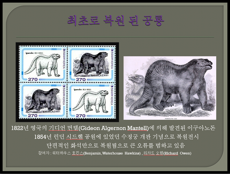공룡우표매니아의 공룡이야기.............2. 5. 최초로 복원된 공룡 6. 최초로 복원 전시된 공룡 7. 완벽한 이구아노돈 화석 8. 수정 보완된 이구아노돈 최초로 복원된 공룡 최초로 발견된 초식공룡이자 공룡이라는 존재가 인류에게 알려지고 본격적인 연구가 시작되는 계기를 만든 공룡으로, 사실상 이구아노돈의 발견이야말로 오늘날의 고생물학을 만들었다고 할 수 있다. 공룡에 워낙 무지하던 시기라, 발견된 뒤 한동안은 녀석이 엄지손가락 발톱을 뿔로 착각하여 코뿔을 단 거대한 코끼리처럼 둔중한 몸집에다 코에 뿔이 달린 기괴한 모습으로 1850년대부터 런던 하이드파크에 전시됐었다. 최초로 복원 전시된 공룡 영국의 치과의사인 멘텔 박사에 의해 발견된 이래 영국의 오언 박사나 프랑스의 조르주 퀴비에 박사 등 ..