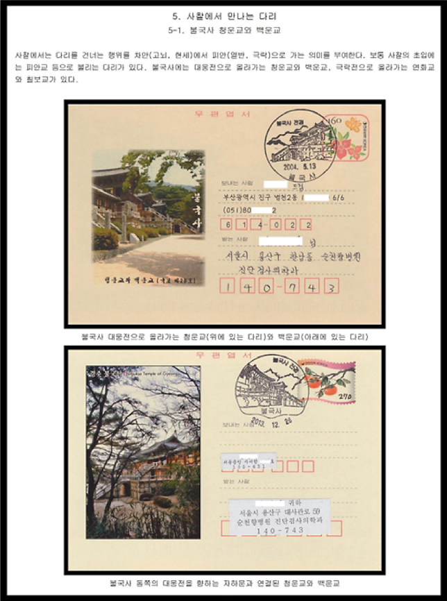 아름다운 다리를 찾아서........... 4. 5. 사찰에서 만나는 다리. 6. 호수에 있는 다리. 경주 불국사 청운교 와 백운교(慶州 佛國寺 靑雲橋 ─ 白雲橋) 경주 불국사 대웅전 전방 자하문 앞에 놓인 석교. 통일 신라 시대에 건립된 것으로, 아래 다리가 청운교이고 위 다리가 백운교이다. 국보(제23호) 정식 명칭은 ‘경주 불국사 청운교 및 백운교’이다. 청운, 백운교를 오르면 자하문을 통해 석가모니예래불이 계시는 대웅전에 들어선다. 청운교는 16단, 백운교는 18단, 총 34단으로 이루어져 있다. 경사는 45도이다. 청운교와 백운교가 이어지는 부분에는 무지개모양의 홍예로 되어있는데, 이는 한국 홍예교, 홍예문의 초기 형태를 보여준다. 다리 아래는 궁륭형으로 만들어 통행을 가능하게 하였으며 윗부분 ..