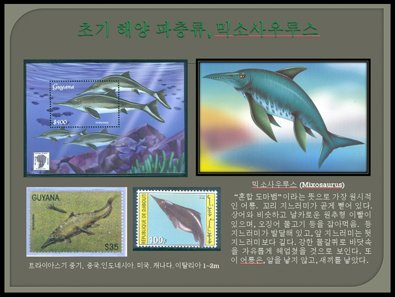 공룡우표매니아의 공룡이야기.............3. 9. 초기의 해양파충류 믹소사우루수스(Mixosaurus) 10. 해양파충류 모사사우우스(Mosasaurus) 11. 해양파충류 플레시오사우루스(Plesiosaurus) 12. 공룡시대의 나무 은행나무(Maidenhair Tree) 초기의 해양파충류 믹소사우루수스(Mixosaurus) 중생대 트라이아스기 중기에 유럽 일대의 바닷속에서 살았던 원시 어룡. 속명은 '섞인 도마뱀'이라는 뜻 오늘날 아시아, 북아메리카 대륙에서 서식했다. 화석은 중국, 이탈리아, 캐나다 등에서 발견되었다. 전체 몸 길이는 약 1m정도 이고, 몸 뒷 부분의 지느러미는 짧고, 꼬리는 반달 모양이다. 강한 물갈퀴로 바닷속을 자유롭게 헤엄쳤을 것으로 보인다. 또 믹소사우루스는 알을 ..