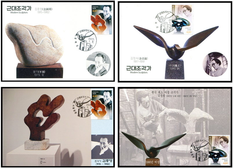 근대 조각가(Modern Sculptors) 기념우표. 초일 자료(M/C. FDC) 우표번호 : 3606 ~ 3607 발행일 : 2022. 7. 7. 디자인 : 김종영 디자이너 : 신재용 용지 : 평판원지 인쇄 맟 색수 : 평판 / 4도 인쇄처 : 한국우편사업진흥원(Royal Joh. Enschede) 오늘날 한국의 조각은 국제적인 사조의 영향으로 사실주의에서 추상주의 조각으로 변화했고, 사용되는 재료도 다양해지고 있습니다. 초기 추상조각의 성장을 이끌었던 대표적인 조각가로는 김종영과 김정숙이 있습니다. # 3606. 근대 조각가 김종연 # 3607 근대 조각가 김정숙 한국 추상조각의 선구자 김종영(1915-1982)은 동서양 어느 쪽에도 치우침 없이 주체적으로 서양미술을 수용한 작가입니다. 어려서부터 ..