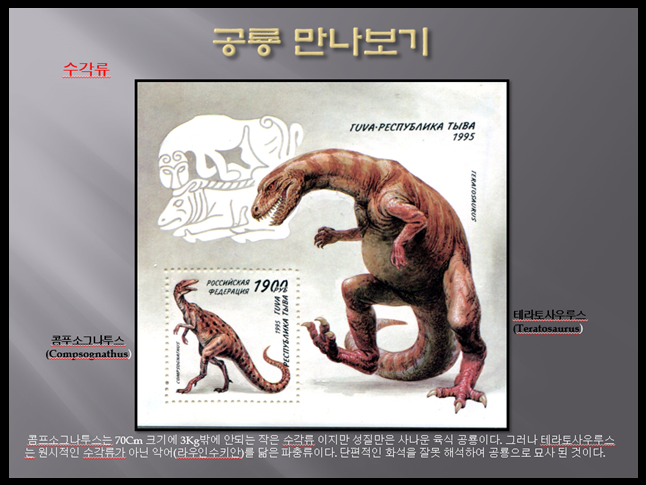공룡우표매니아의 공룡이야기.............16. 4. 공룡 만나 보기. 7. 콤프소그나투스(Compsognathus). 8. 엘라프로사우루스(Elaphrosaurus). 9. 기가노토사우루스(Giganotosaurus). 10. 스피노사우루스(Spinosaurus). 콤프소그나투스(Compsognathus) 수각류에 속했던 동물. ‘콤프소그나투스’라는 이름은 '턱룡'이라는 의미이다. 쥐라기 후기 화석으로 알려진 작은 크기의 포식성 공룡의 한 속(屬)으로, 골격과 구조에 있어서 아르카이옵테릭스와 매우 유사했다. 크기는 약 70cm~1.4m, 무게는 약 3~3.5kg였다. 머리는 작고 뾰족했으며, 목은 쉽게 구부릴 수 있었고 날카로운 이빨을 가졌다. 다리는 새와 같이 길고 가냘팠는데, 두 개의 발가락..