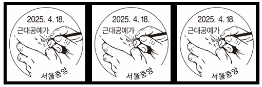 근 대 공 예 가 우 표 발 행 우표발행일 : 2025년 4월 18일. 우표번호 : 3805 ~ 3807명 칭 : 근대공예가 . 디자이너 : 김미화.디 자 인 : 이학응(철제은입사인주합) 송주안(나전 석란나비문 서류함)황종구(청자상감 원추리누늬 긴병)발 행 량 : 총 495.000장. 용 지 : 평판 원지.우표크기 : 25mm x 52.5mm. 인 면 : 23.5mm x 52.5mm.액면가격 : 430원. 인쇄 / 색수 / 특수처리 : 평판 / 4도 / 광택필름 + 엠보싱전지구성 : (5x3)(182mm x182mm).인 쇄 처 : 한국우편사업진흥원 / Royal Joh. Enschede다음 발행 우표 : 사랑스러운 아기. 2025년 5월 8일. 근 대 공 예 가 한국 근대 공예는 전통 기법..