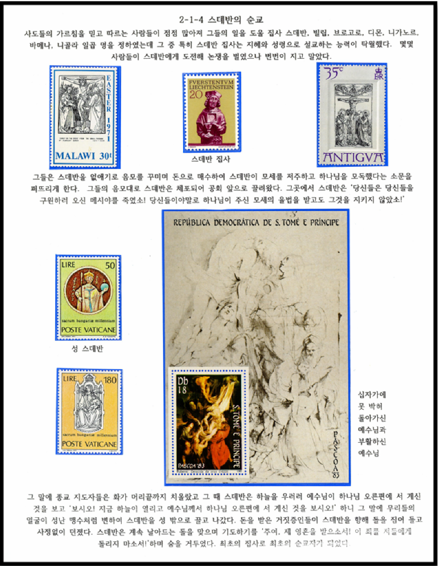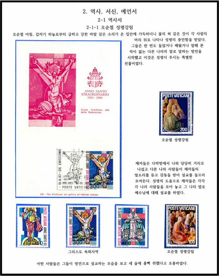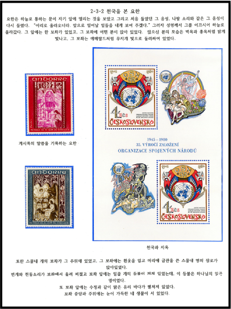 우표로 엮는 성경(신약) 이야기.... 26.(마지막 회) 2- 3 예언서 " 예언서 "는 오늘날의 유다교와 그리스도교 성경 속에 예언서 열여섯 권에 대한 연구서이다. 예언서 본문의 역사와 신학에 대한 이해를 제시한다. 예언서의 신학을 이해하는 것을 구체적 시대 상황에서 역사적 의도를 가지고 예언서를 집필한 저자들이 오늘날 우리에게 무엇을 말하는지 이해하는 작업으로 파악된다. 2 - 3 - 2. 천국을 본 요한 예수님께서 우리를 구원하기 위해 육신을 입고 세상에 오실 때에 먼저 와서 주님의 오실 길을 예비하는 사람이 침례요한이었습니다. 요한은 와서 “회개하라 천국이 가까이 왔느니라”고 외치며 복음을 전했습니다. 침례요한은 천국을 전하는 사람이었습니다. 우리는 다시 오실 예수님의 재림의 길을 준비하는 21..
