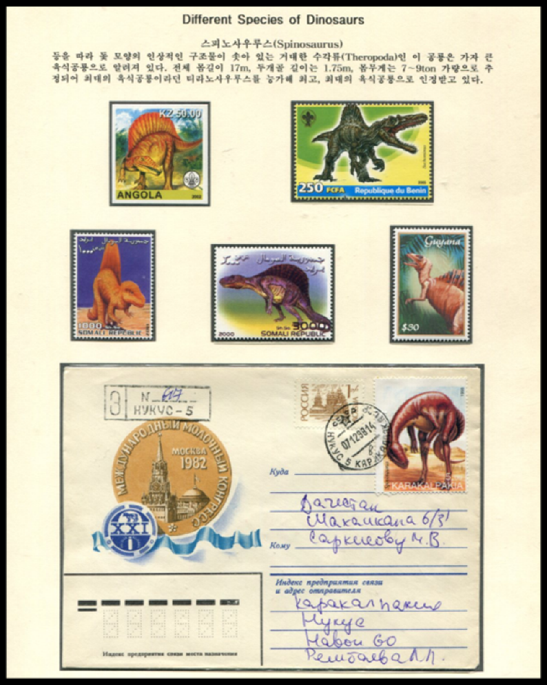 우표로 보는 공룡의 종류...... 175. 스피노사우루스(Spinosaurus). 스테고사우루스(Stegosaurus). 스피노사우루스(Spinosaurus). 두개골이 악어의 두개골처럼 생긴 거대한 포식자 스피노사우루스는 백악기(1억 1200만 년 전~9700만 년 전)에 살았으며 북아프리카의 이집트, 모로코, 니제르 지역에서 발견된 육식 공룡이다. 수각류인 스피노사우루스는 ‘가시 도마뱀’이란 의미를 가지고 있다. 가장 큰 특징은 등 위로 부채모양의 돛을 가지고 있다는 점인데, 등뼈가 길어지면서 생긴 돛은 체온 조절과 다른 공룡에게 위협적으로 느낄 수 있게 몸을 더 크게 보이는 기능과 효과를 가지고 있었다. (국립중앙과락관 공룡과학관) 스테고사우루스(Stegosaurus) 검룡류에 속하는 공룡 스테고..